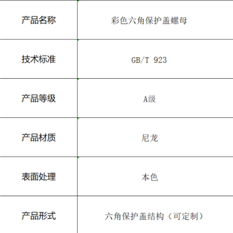 本产品为符合GB/T 923标准的彩色六角保护盖螺母,采用优质尼龙材料制造。精巧的六角形盖体设计能完美包裹标准螺母,在提供有效防护的同时,通过丰富的颜色选择实现美观标识功能,兼顾保护性与视觉管理需求。