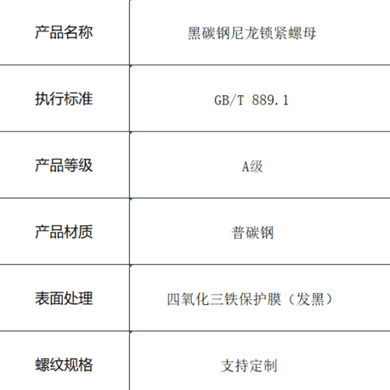 本产品为符合GB/T 889.1标准的A级尼龙锁紧螺母,采用普碳钢制造并经过发黑处理形成四氧化三铁保护膜。螺母内置尼龙锁紧环,通过弹性变形产生持续锁紧力,有效防止螺纹连接松动,适用于需要可靠防振的场合。