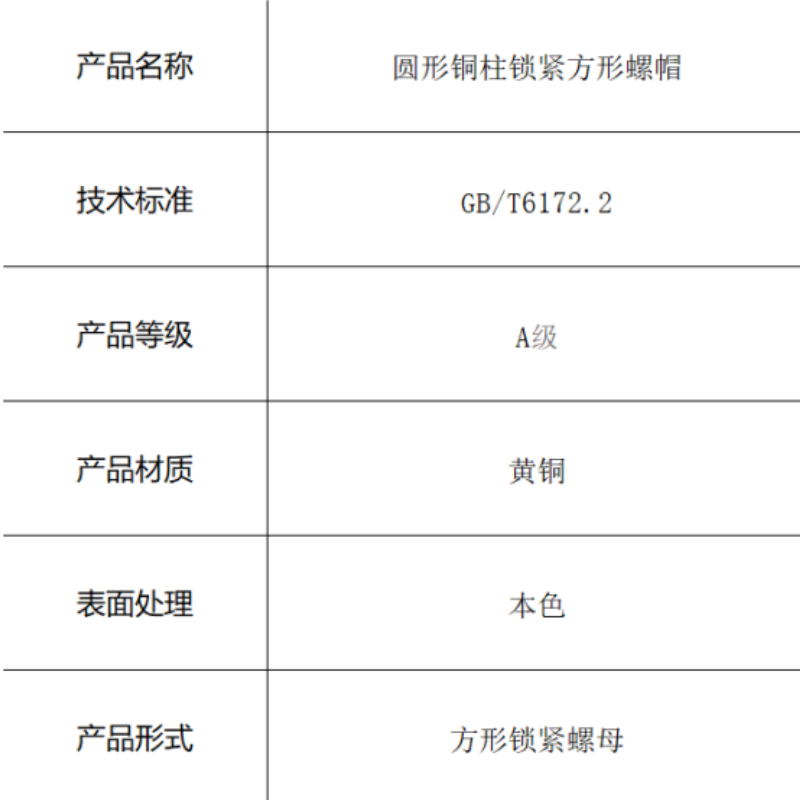 本产品为符合GB/T6172.2标准的圆形铜柱锁紧方形螺帽,采用高品质黄铜材料制造。创新的圆形柱体与方形螺母一体化设计,既便于工具紧固又能有效防止安装后转动,黄铜材质提供优良的导电性和耐腐蚀性,本色处理保持材料天然特性,适用于需要防转锁紧和良好电导连接的场合。